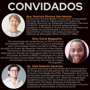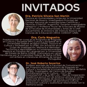 Participarán de este webinario como invitadas la Dra. Patricia Silvana San Martín, Profesora de la Universidad Nacional de Rosario (UNR), investigadora del Consejo Nacional de Investigaciones Científicas y Técnicas (CONICET) y directora del Instituto Rosario de Ciencias de la Educación (CONICET-UNR); la Dra. Carla Nogueira, posdoctoranda en el Programa de Posgrado en Cultura y Sociedad de la Universidad Federal de Bahía, y como invitado el Dr. José Roberto Severino, Profesor asociado de la Universidad Federal de Bahía, e investigador del Centro de Estudios Multidiscilplinarios en Cultura y de la Red de Cooperación académica para el Patrimonio Cultural Inmaterial de América Latina y el Caribe. La moderación estará a cargo del Dr. André Luis Ramos Soares, Profesor del Programa de Postgrado en Patrimonio Cultural de la Universidad Federal de Santa María.