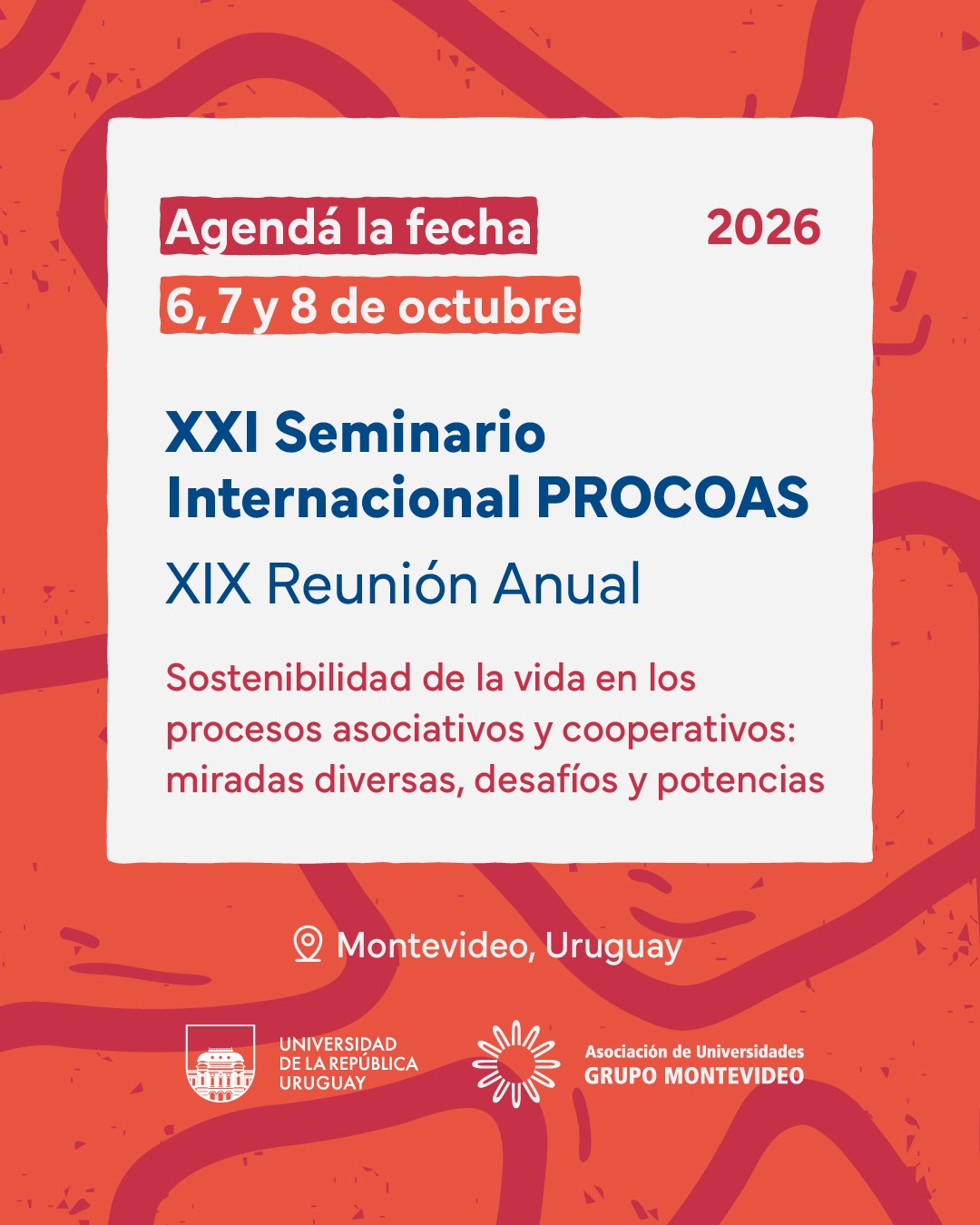 El Comité Académico de Procesos Cooperativos y Asociativos (PROCOAS) de la Asociación de Universidades — Grupo Montevideo (AUGM) convoca al XXI Seminario Internacional PROCOAS y XXIV Reunión Anual, que se desarrollará los días 6, 7 y 8 de octubre de 2026 en la Universidad de la República (Uruguay).